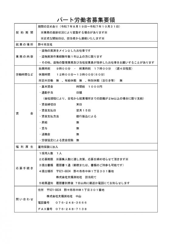 (2025/8/22 追記)募集は終了いたしました。ありがとうございました。 下記内容にてパートタイマーを募集します。ご興味のある方はお問い合わせ先まで…