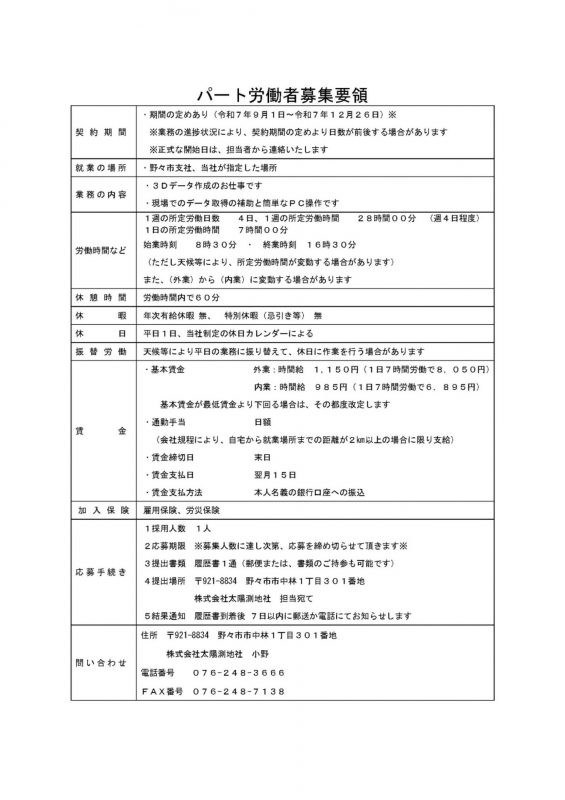 (2025/9/8追記)募集は終了いたしました。ありがとうございました。 下記内容にてパートタイマーを募集します。ご興味のある方はお問い合わせ先までご連…