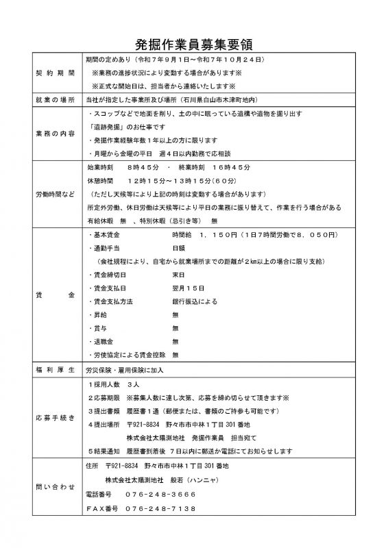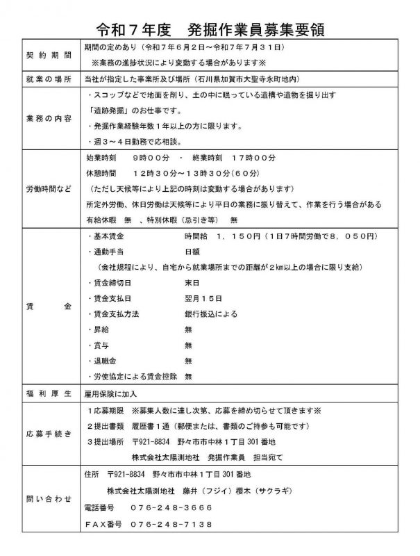 (2025/6/26 追記)募集は終了いたしました。ありがとうございました。 下記内容にて発掘作業員を募集します。ご興味のある方はお問い合わせ先までご連…