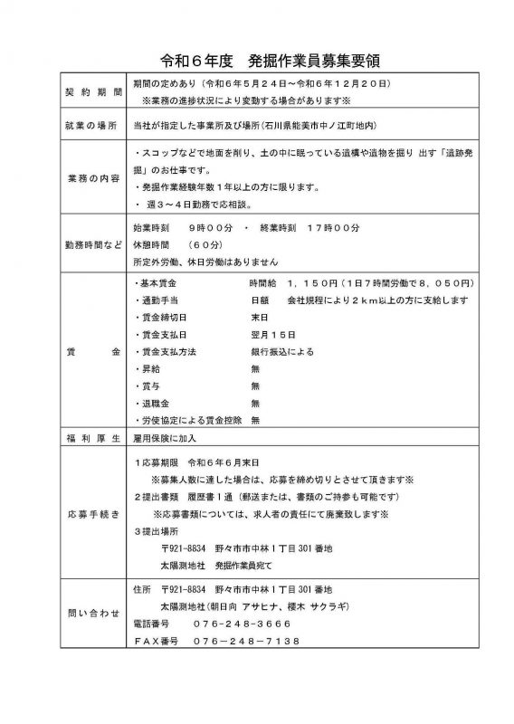 (2024/6/24 追記)募集は終了いたしました。ありがとうございました。 下記内容にて発掘作業員を募集します。ご興味のある方はお問い合わせ先までご連…