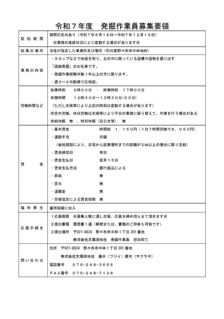 下記内容にて発掘作業員を募集します。ご興味のある方はお問い合わせ先までご連絡下さい。