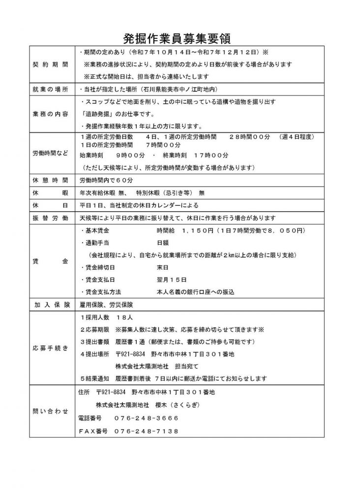 下記内容にて発掘作業員を募集します。ご興味のある方はお問い合わせ先までご連絡下さい。