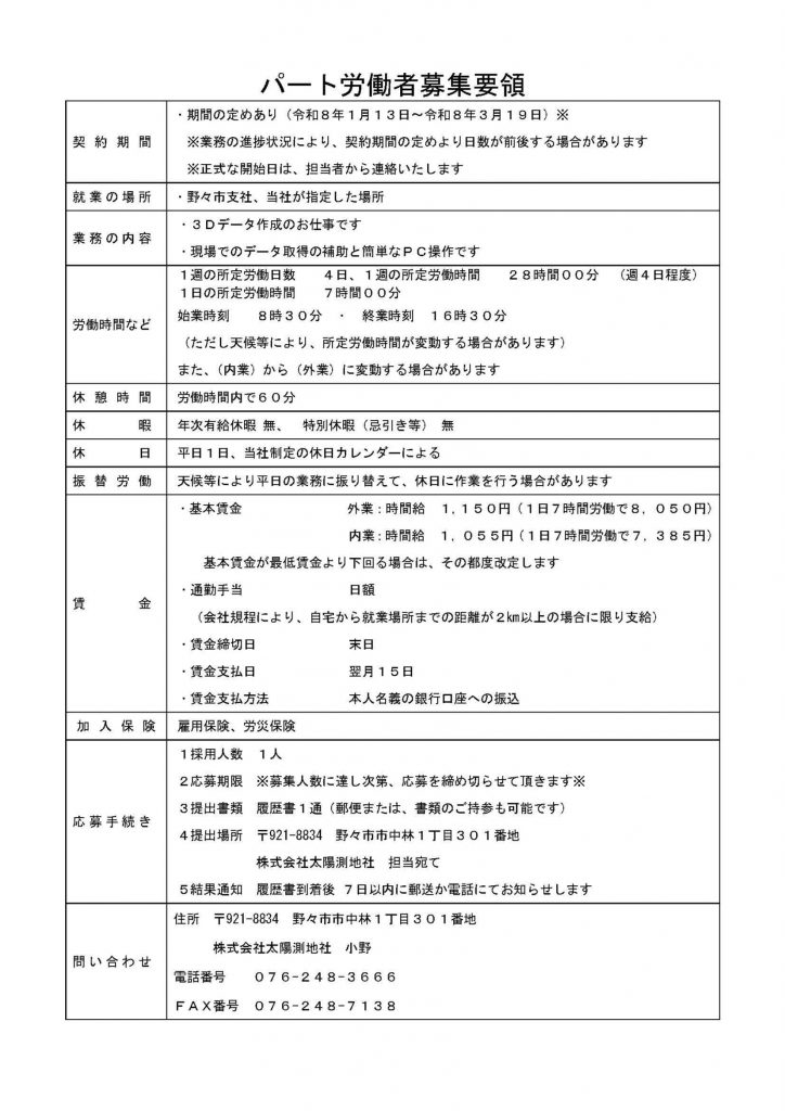 下記内容にてパートタイマーを募集します。ご興味のある方はお問い合わせ先までご連絡下さい。
